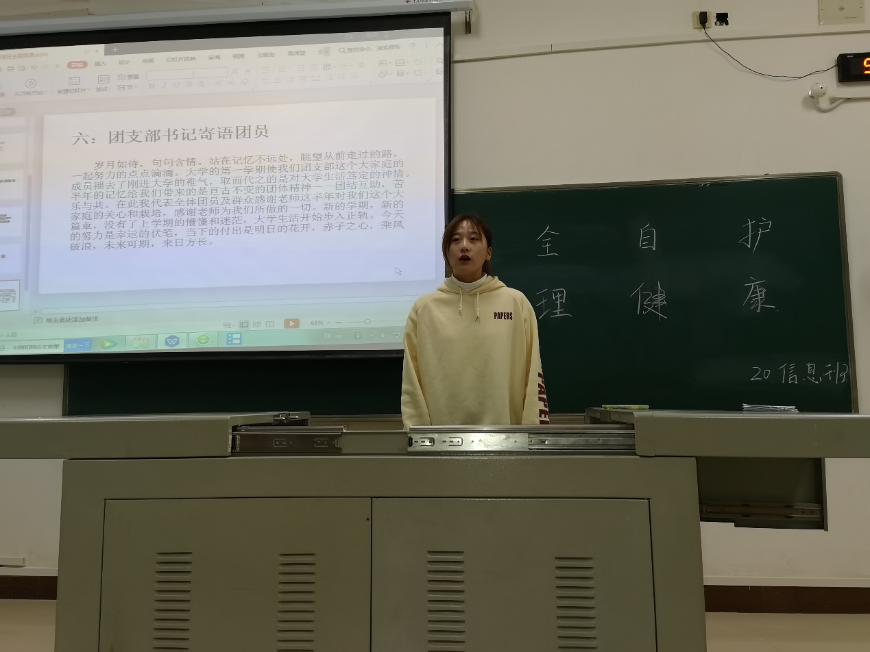 20级班主任赵丹老师在班会上重点强调:“大学生的生活就是社会生活的投影,保持良好的心理健康是尤其至关重要的。心理健康是大学生成才的基础,可以促进大学生全面发展。健康的心理品质是大学生全面发展的基本要求,同时也是将来走向社会,在工作岗位上发挥智力水平、积极从事社会活动以及不断向更高层次发展的重要条件。”